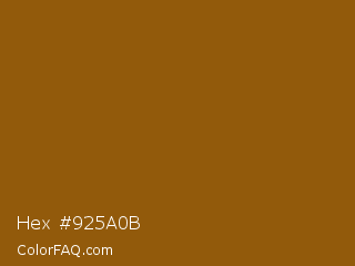 Hex #925a0b Color is a normal orange color and the nearest color is Rusty Nail #86560a. Hex code #925a0b and RGB value is rgb(146,90,11). In RGB color space, this color is composed of 57% red, 35% green, 4% blue, In CMYK color space, this color is composed of 0% cyan, 38% magenta, 92% yellow , 43% black , In HSL color space, this color has a hue angle of 35° , 86% saturation and 31% lightness.