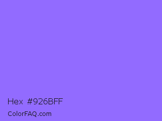 Hex #926bff Color is a light indigo color and the nearest color is Navy Purple #9457eb. Hex code #926bff and RGB value is rgb(146,107,255). In RGB color space, this color is composed of 57% red, 42% green, 100% blue, In CMYK color space, this color is composed of 43% cyan, 58% magenta, 0% yellow , 0% black , In HSL color space, this color has a hue angle of 256° , 100% saturation and 71% lightness.