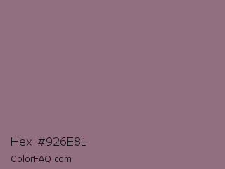 Hex #926e81 Color is a normal rose color and the nearest color is Bazaar #98777b. Hex code #926e81 and RGB value is rgb(146,110,129). In RGB color space, this color is composed of 57% red, 43% green, 51% blue, In CMYK color space, this color is composed of 0% cyan, 25% magenta, 12% yellow , 43% black , In HSL color space, this color has a hue angle of 328° , 14% saturation and 50% lightness.