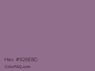 Hex #926e8d Color is a normal magenta color and the nearest color is Strikemaster #956387. Hex code #926e8d and RGB value is rgb(146,110,141). In RGB color space, this color is composed of 57% red, 43% green, 55% blue, In CMYK color space, this color is composed of 0% cyan, 25% magenta, 3% yellow , 43% black , In HSL color space, this color has a hue angle of 308° , 14% saturation and 50% lightness.