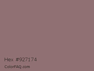 Hex #927174 Color is a normal red color and the nearest color is Opium #8e6f70. Hex code #927174 and RGB value is rgb(146,113,116). In RGB color space, this color is composed of 57% red, 44% green, 45% blue, In CMYK color space, this color is composed of 0% cyan, 23% magenta, 21% yellow , 43% black , In HSL color space, this color has a hue angle of 355° , 13% saturation and 51% lightness.