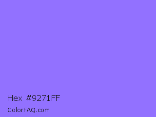 Hex #9271ff Color is a light indigo color and the nearest color is Medium Slate Blue #7b68ee. Hex code #9271ff and RGB value is rgb(146,113,255). In RGB color space, this color is composed of 57% red, 44% green, 100% blue, In CMYK color space, this color is composed of 43% cyan, 56% magenta, 0% yellow , 0% black , In HSL color space, this color has a hue angle of 254° , 100% saturation and 72% lightness.