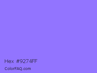 Hex #9274ff Color is a light indigo color and the nearest color is Medium Slate Blue #7b68ee. Hex code #9274ff and RGB value is rgb(146,116,255). In RGB color space, this color is composed of 57% red, 45% green, 100% blue, In CMYK color space, this color is composed of 43% cyan, 55% magenta, 0% yellow , 0% black , In HSL color space, this color has a hue angle of 253° , 100% saturation and 73% lightness.