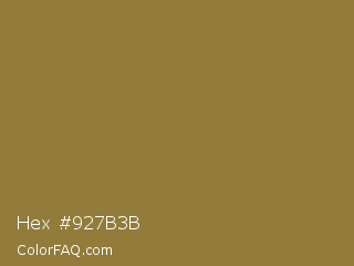 Hex #927b3b Color is a normal orange color and the nearest color is Metallic Sunburst #9c7c38. Hex code #927b3b and RGB value is rgb(146,123,59). In RGB color space, this color is composed of 57% red, 48% green, 23% blue, In CMYK color space, this color is composed of 0% cyan, 16% magenta, 60% yellow , 43% black , In HSL color space, this color has a hue angle of 44° , 42% saturation and 40% lightness.