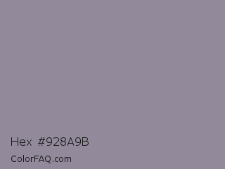Hex #928a9b Color is a normal violet color and the nearest color is Manatee Crayola #8d90a1. Hex code #928a9b and RGB value is rgb(146,138,155). In RGB color space, this color is composed of 57% red, 54% green, 61% blue, In CMYK color space, this color is composed of 6% cyan, 11% magenta, 0% yellow , 39% black , In HSL color space, this color has a hue angle of 268° , 8% saturation and 57% lightness.