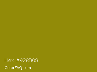 Hex #928b08 Color is a dark yellow color and the nearest color is Dark Yellow #9b870c. Hex code #928b08 and RGB value is rgb(146,139,8). In RGB color space, this color is composed of 57% red, 55% green, 3% blue, In CMYK color space, this color is composed of 0% cyan, 5% magenta, 95% yellow , 43% black , In HSL color space, this color has a hue angle of 57° , 90% saturation and 30% lightness.