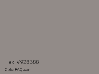Hex #928b88 Color is a normal orange color and the nearest color is Stack #8a8f8a. Hex code #928b88 and RGB value is rgb(146,139,136). In RGB color space, this color is composed of 57% red, 55% green, 53% blue, In CMYK color space, this color is composed of 0% cyan, 5% magenta, 7% yellow , 43% black , In HSL color space, this color has a hue angle of 18° , 4% saturation and 55% lightness.