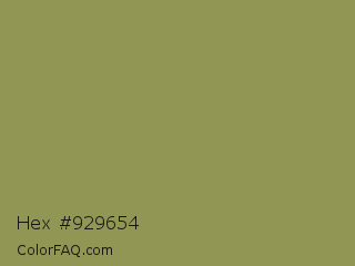 Hex #929654 Color is a normal yellow color and the nearest color is Moss Green #8a9a5b. Hex code #929654 and RGB value is rgb(146,150,84). In RGB color space, this color is composed of 57% red, 59% green, 33% blue, In CMYK color space, this color is composed of 3% cyan, 0% magenta, 44% yellow , 41% black , In HSL color space, this color has a hue angle of 64° , 28% saturation and 46% lightness.