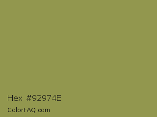 Hex #92974e Color is a normal yellow color and the nearest color is Moss Green #8a9a5b. Hex code #92974e and RGB value is rgb(146,151,78). In RGB color space, this color is composed of 57% red, 59% green, 31% blue, In CMYK color space, this color is composed of 3% cyan, 0% magenta, 48% yellow , 41% black , In HSL color space, this color has a hue angle of 64° , 32% saturation and 45% lightness.