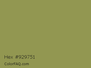 Hex #929751 Color is a normal yellow color and the nearest color is Moss Green #8a9a5b. Hex code #929751 and RGB value is rgb(146,151,81). In RGB color space, this color is composed of 57% red, 59% green, 32% blue, In CMYK color space, this color is composed of 3% cyan, 0% magenta, 46% yellow , 41% black , In HSL color space, this color has a hue angle of 64° , 30% saturation and 45% lightness.