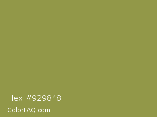 Hex #929848 Color is a normal yellow color and the nearest color is Sycamore #908d39. Hex code #929848 and RGB value is rgb(146,152,72). In RGB color space, this color is composed of 57% red, 60% green, 28% blue, In CMYK color space, this color is composed of 4% cyan, 0% magenta, 53% yellow , 40% black , In HSL color space, this color has a hue angle of 65° , 36% saturation and 44% lightness.