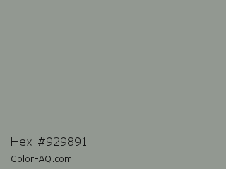 Hex #929891 Color is a normal green color and the nearest color is Mountain Mist #959396. Hex code #929891 and RGB value is rgb(146,152,145). In RGB color space, this color is composed of 57% red, 60% green, 57% blue, In CMYK color space, this color is composed of 4% cyan, 0% magenta, 5% yellow , 40% black , In HSL color space, this color has a hue angle of 111° , 3% saturation and 58% lightness.