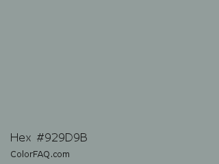 Hex #929d9b Color is a normal cyan color and the nearest color is Morning Blue #8da399. Hex code #929d9b and RGB value is rgb(146,157,155). In RGB color space, this color is composed of 57% red, 62% green, 61% blue, In CMYK color space, this color is composed of 7% cyan, 0% magenta, 1% yellow , 38% black , In HSL color space, this color has a hue angle of 169° , 5% saturation and 59% lightness.