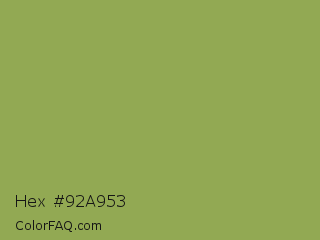 Hex #92a953 Color is a normal lime color and the nearest color is Chelsea Cucumber #83aa5d. Hex code #92a953 and RGB value is rgb(146,169,83). In RGB color space, this color is composed of 57% red, 66% green, 33% blue, In CMYK color space, this color is composed of 14% cyan, 0% magenta, 51% yellow , 34% black , In HSL color space, this color has a hue angle of 76° , 34% saturation and 49% lightness.