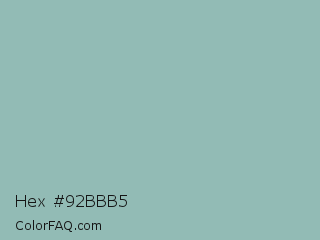 Hex #92bbb5 Color is a light cyan color and the nearest color is Summer Green #96bbab. Hex code #92bbb5 and RGB value is rgb(146,187,181). In RGB color space, this color is composed of 57% red, 73% green, 71% blue, In CMYK color space, this color is composed of 22% cyan, 0% magenta, 3% yellow , 27% black , In HSL color space, this color has a hue angle of 171° , 23% saturation and 65% lightness.