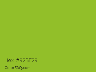 Hex #92bf29 Color is a normal lime color and the nearest color is Atlantis #97cd2d. Hex code #92bf29 and RGB value is rgb(146,191,41). In RGB color space, this color is composed of 57% red, 75% green, 16% blue, In CMYK color space, this color is composed of 24% cyan, 0% magenta, 79% yellow , 25% black , In HSL color space, this color has a hue angle of 78° , 65% saturation and 45% lightness.