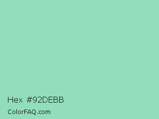 Hex #92debb Color is a light green color and the nearest color is Algae Green #93dfb8. Hex code #92debb and RGB value is rgb(146,222,187). In RGB color space, this color is composed of 57% red, 87% green, 73% blue, In CMYK color space, this color is composed of 34% cyan, 0% magenta, 16% yellow , 13% black , In HSL color space, this color has a hue angle of 152° , 54% saturation and 72% lightness.