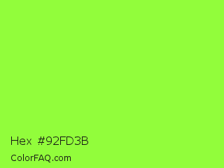 Hex #92fd3b Color is a light green color and the nearest color is French Lime #9efd38. Hex code #92fd3b and RGB value is rgb(146,253,59). In RGB color space, this color is composed of 57% red, 99% green, 23% blue, In CMYK color space, this color is composed of 42% cyan, 0% magenta, 77% yellow , 1% black , In HSL color space, this color has a hue angle of 93° , 98% saturation and 61% lightness.