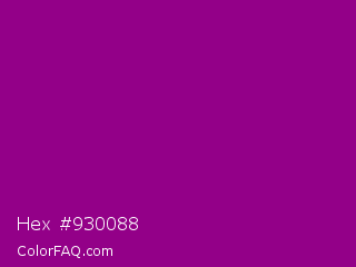 Hex #930088 Color is a dark magenta color and the nearest color is Dark Magenta #8b008b. Hex code #930088 and RGB value is rgb(147,0,136). In RGB color space, this color is composed of 58% red, 0% green, 53% blue, In CMYK color space, this color is composed of 0% cyan, 100% magenta, 7% yellow , 42% black , In HSL color space, this color has a hue angle of 304° , 100% saturation and 29% lightness.