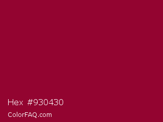 Hex #930430 Color is a dark rose color and the nearest color is Pink Raspberry #980036. Hex code #930430 and RGB value is rgb(147,4,48). In RGB color space, this color is composed of 58% red, 2% green, 19% blue, In CMYK color space, this color is composed of 0% cyan, 97% magenta, 67% yellow , 42% black , In HSL color space, this color has a hue angle of 342° , 95% saturation and 30% lightness.