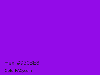 Hex #930be8 Color is a normal purple color and the nearest color is Dark Violet #9400d3. Hex code #930be8 and RGB value is rgb(147,11,232). In RGB color space, this color is composed of 58% red, 4% green, 91% blue, In CMYK color space, this color is composed of 37% cyan, 95% magenta, 0% yellow , 9% black , In HSL color space, this color has a hue angle of 277° , 91% saturation and 48% lightness.