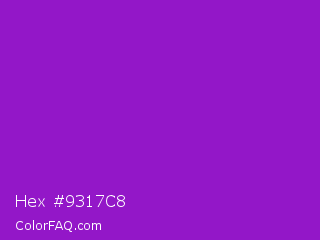 Hex #9317c8 Color is a normal purple color and the nearest color is French Violet #8806ce. Hex code #9317c8 and RGB value is rgb(147,23,200). In RGB color space, this color is composed of 58% red, 9% green, 78% blue, In CMYK color space, this color is composed of 27% cyan, 89% magenta, 0% yellow , 22% black , In HSL color space, this color has a hue angle of 282° , 79% saturation and 44% lightness.