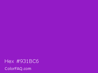 Hex #931bc6 Color is a normal purple color and the nearest color is Dark Orchid #9932cc. Hex code #931bc6 and RGB value is rgb(147,27,198). In RGB color space, this color is composed of 58% red, 11% green, 78% blue, In CMYK color space, this color is composed of 26% cyan, 86% magenta, 0% yellow , 22% black , In HSL color space, this color has a hue angle of 282° , 76% saturation and 44% lightness.