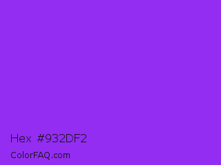 Hex #932df2 Color is a normal purple color and the nearest color is Blue Violet #8a2be2. Hex code #932df2 and RGB value is rgb(147,45,242). In RGB color space, this color is composed of 58% red, 18% green, 95% blue, In CMYK color space, this color is composed of 39% cyan, 81% magenta, 0% yellow , 5% black , In HSL color space, this color has a hue angle of 271° , 88% saturation and 56% lightness.