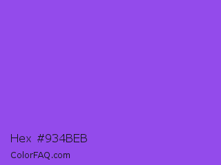 Hex #934beb Color is a light violet color and the nearest color is Navy Purple #9457eb. Hex code #934beb and RGB value is rgb(147,75,235). In RGB color space, this color is composed of 58% red, 29% green, 92% blue, In CMYK color space, this color is composed of 37% cyan, 68% magenta, 0% yellow , 8% black , In HSL color space, this color has a hue angle of 267° , 80% saturation and 61% lightness.