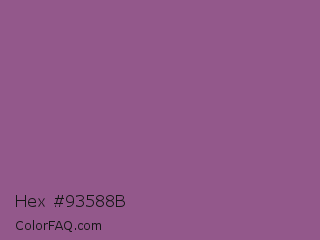 Hex #93588b Color is a normal magenta color and the nearest color is Antique Fuchsia #915c83. Hex code #93588b and RGB value is rgb(147,88,139). In RGB color space, this color is composed of 58% red, 35% green, 55% blue, In CMYK color space, this color is composed of 0% cyan, 40% magenta, 5% yellow , 42% black , In HSL color space, this color has a hue angle of 308° , 25% saturation and 46% lightness.