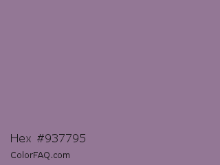 Hex #937795 Color is a normal magenta color and the nearest color is Mountbatten Pink #997a8d. Hex code #937795 and RGB value is rgb(147,119,149). In RGB color space, this color is composed of 58% red, 47% green, 58% blue, In CMYK color space, this color is composed of 1% cyan, 20% magenta, 0% yellow , 42% black , In HSL color space, this color has a hue angle of 296° , 12% saturation and 53% lightness.