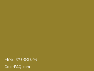 Hex #93802b Color is a normal yellow color and the nearest color is Metallic Sunburst #9c7c38. Hex code #93802b and RGB value is rgb(147,128,43). In RGB color space, this color is composed of 58% red, 50% green, 17% blue, In CMYK color space, this color is composed of 0% cyan, 13% magenta, 71% yellow , 42% black , In HSL color space, this color has a hue angle of 49° , 55% saturation and 37% lightness.