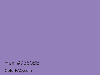 Hex #9380bb Color is a light indigo color and the nearest color is Lavender Purple #967bb6. Hex code #9380bb and RGB value is rgb(147,128,187). In RGB color space, this color is composed of 58% red, 50% green, 73% blue, In CMYK color space, this color is composed of 21% cyan, 32% magenta, 0% yellow , 27% black , In HSL color space, this color has a hue angle of 259° , 30% saturation and 62% lightness.