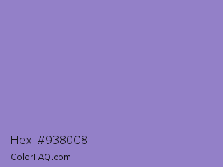 Hex #9380c8 Color is a light indigo color and the nearest color is Ube #8878c3. Hex code #9380c8 and RGB value is rgb(147,128,200). In RGB color space, this color is composed of 58% red, 50% green, 78% blue, In CMYK color space, this color is composed of 27% cyan, 36% magenta, 0% yellow , 22% black , In HSL color space, this color has a hue angle of 256° , 40% saturation and 64% lightness.