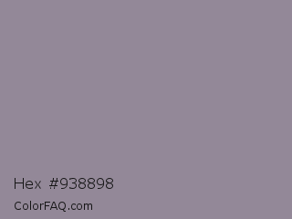 Hex #938898 Color is a normal purple color and the nearest color is Venus #928590. Hex code #938898 and RGB value is rgb(147,136,152). In RGB color space, this color is composed of 58% red, 53% green, 60% blue, In CMYK color space, this color is composed of 3% cyan, 11% magenta, 0% yellow , 40% black , In HSL color space, this color has a hue angle of 281° , 7% saturation and 56% lightness.