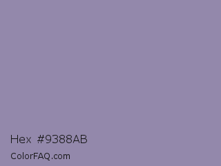 Hex #9388ab Color is a normal indigo color and the nearest color is Cool Grey #8c92ac. Hex code #9388ab and RGB value is rgb(147,136,171). In RGB color space, this color is composed of 58% red, 53% green, 67% blue, In CMYK color space, this color is composed of 14% cyan, 20% magenta, 0% yellow , 33% black , In HSL color space, this color has a hue angle of 259° , 17% saturation and 60% lightness.