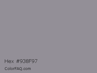 Hex #938f97 Color is a normal violet color and the nearest color is Mountain Mist #959396. Hex code #938f97 and RGB value is rgb(147,143,151). In RGB color space, this color is composed of 58% red, 56% green, 59% blue, In CMYK color space, this color is composed of 3% cyan, 5% magenta, 0% yellow , 41% black , In HSL color space, this color has a hue angle of 270° , 4% saturation and 58% lightness.