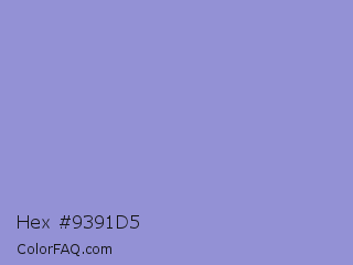 Hex #9391d5 Color is a light indigo color and the nearest color is Blue Bell Crayola #9999cc. Hex code #9391d5 and RGB value is rgb(147,145,213). In RGB color space, this color is composed of 58% red, 57% green, 84% blue, In CMYK color space, this color is composed of 31% cyan, 32% magenta, 0% yellow , 16% black , In HSL color space, this color has a hue angle of 242° , 45% saturation and 70% lightness.