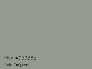 Hex #939b8e Color is a normal green color and the nearest color is Mantle #8b9c90. Hex code #939b8e and RGB value is rgb(147,155,142). In RGB color space, this color is composed of 58% red, 61% green, 56% blue, In CMYK color space, this color is composed of 5% cyan, 0% magenta, 8% yellow , 39% black , In HSL color space, this color has a hue angle of 97° , 6% saturation and 58% lightness.