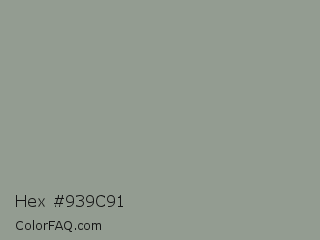 Hex #939c91 Color is a normal green color and the nearest color is Mantle #8b9c90. Hex code #939c91 and RGB value is rgb(147,156,145). In RGB color space, this color is composed of 58% red, 61% green, 57% blue, In CMYK color space, this color is composed of 6% cyan, 0% magenta, 7% yellow , 39% black , In HSL color space, this color has a hue angle of 109° , 5% saturation and 59% lightness.