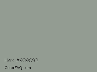 Hex #939c92 Color is a normal green color and the nearest color is Mantle #8b9c90. Hex code #939c92 and RGB value is rgb(147,156,146). In RGB color space, this color is composed of 58% red, 61% green, 57% blue, In CMYK color space, this color is composed of 6% cyan, 0% magenta, 6% yellow , 39% black , In HSL color space, this color has a hue angle of 114° , 5% saturation and 59% lightness.