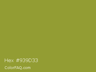 Hex #939d33 Color is a normal yellow color and the nearest color is Sycamore #908d39. Hex code #939d33 and RGB value is rgb(147,157,51). In RGB color space, this color is composed of 58% red, 62% green, 20% blue, In CMYK color space, this color is composed of 6% cyan, 0% magenta, 68% yellow , 38% black , In HSL color space, this color has a hue angle of 66° , 51% saturation and 41% lightness.