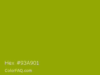 Hex #93a901 Color is a normal yellow color and the nearest color is Apple Green #8db600. Hex code #93a901 and RGB value is rgb(147,169,1). In RGB color space, this color is composed of 58% red, 66% green, 0% blue, In CMYK color space, this color is composed of 13% cyan, 0% magenta, 99% yellow , 34% black , In HSL color space, this color has a hue angle of 68° , 99% saturation and 33% lightness.