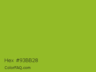Hex #93bb28 Color is a normal lime color and the nearest color is Atlantis #97cd2d. Hex code #93bb28 and RGB value is rgb(147,187,40). In RGB color space, this color is composed of 58% red, 73% green, 16% blue, In CMYK color space, this color is composed of 21% cyan, 0% magenta, 79% yellow , 27% black , In HSL color space, this color has a hue angle of 76° , 65% saturation and 45% lightness.