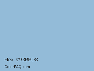 Hex #93bbd8 Color is a light blue color and the nearest color is Dark Sky Blue #8cbed6. Hex code #93bbd8 and RGB value is rgb(147,187,216). In RGB color space, this color is composed of 58% red, 73% green, 85% blue, In CMYK color space, this color is composed of 32% cyan, 13% magenta, 0% yellow , 15% black , In HSL color space, this color has a hue angle of 205° , 47% saturation and 71% lightness.