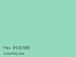 Hex #93d9be Color is a light green color and the nearest color is Algae Green #93dfb8. Hex code #93d9be and RGB value is rgb(147,217,190). In RGB color space, this color is composed of 58% red, 85% green, 75% blue, In CMYK color space, this color is composed of 32% cyan, 0% magenta, 12% yellow , 15% black , In HSL color space, this color has a hue angle of 157° , 48% saturation and 71% lightness.