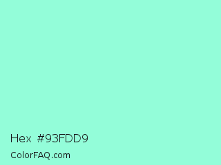 Hex #93fdd9 Color is a light green color and the nearest color is Aquamarine #7fffd4. Hex code #93fdd9 and RGB value is rgb(147,253,217). In RGB color space, this color is composed of 58% red, 99% green, 85% blue, In CMYK color space, this color is composed of 42% cyan, 0% magenta, 14% yellow , 1% black , In HSL color space, this color has a hue angle of 160° , 96% saturation and 78% lightness.