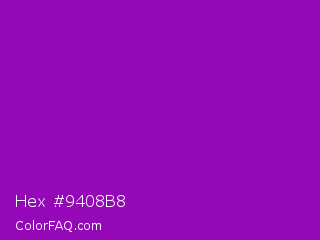 Hex #9408b8 Color is a normal purple color and the nearest color is Violet RYB #8601af. Hex code #9408b8 and RGB value is rgb(148,8,184). In RGB color space, this color is composed of 58% red, 3% green, 72% blue, In CMYK color space, this color is composed of 20% cyan, 96% magenta, 0% yellow , 28% black , In HSL color space, this color has a hue angle of 288° , 92% saturation and 38% lightness.
