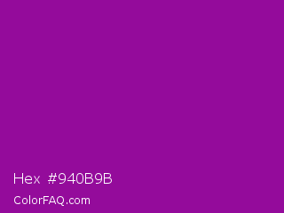 Hex #940b9b Color is a normal magenta color and the nearest color is Violet Eggplant #991199. Hex code #940b9b and RGB value is rgb(148,11,155). In RGB color space, this color is composed of 58% red, 4% green, 61% blue, In CMYK color space, this color is composed of 5% cyan, 93% magenta, 0% yellow , 39% black , In HSL color space, this color has a hue angle of 297° , 87% saturation and 33% lightness.