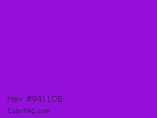 Hex #9411db Color is a normal purple color and the nearest color is Dark Violet #9400d3. Hex code #9411db and RGB value is rgb(148,17,219). In RGB color space, this color is composed of 58% red, 7% green, 86% blue, In CMYK color space, this color is composed of 32% cyan, 92% magenta, 0% yellow , 14% black , In HSL color space, this color has a hue angle of 279° , 86% saturation and 46% lightness.